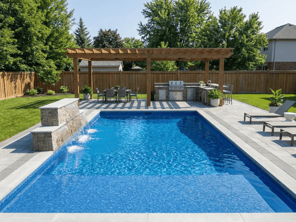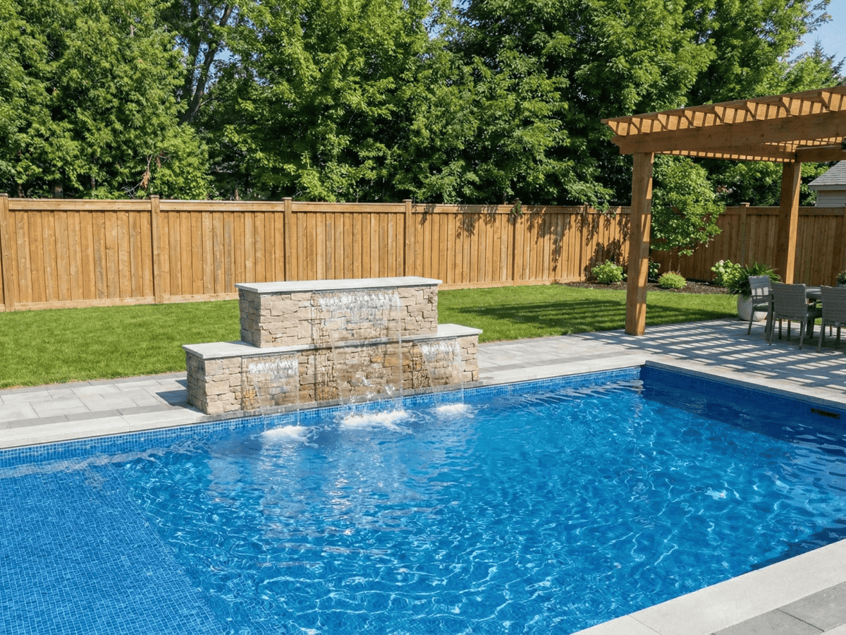 The Victoria Falls 9 modern pool waterfall is an architectural water feature designed specifically for installation along the straight edge of a swimming pool. Its expanded width and tiered profile make it an excellent choice for contemporary and luxury pool designs seeking a strong visual presence with layered water movement.